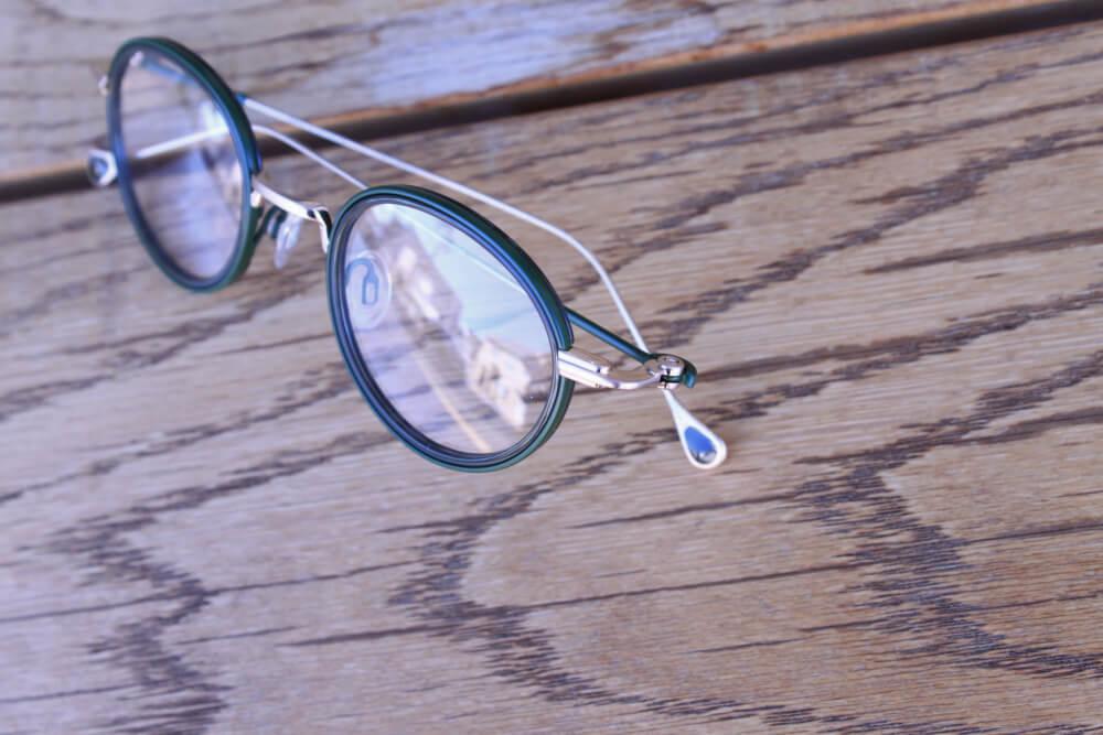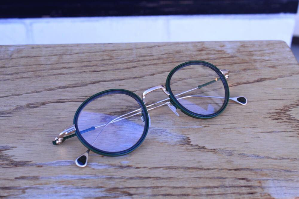 深いグリーンのアセテートリムが、顔まわりの表情を自然に引き締める